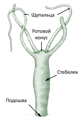 Особенности строения и жизнедеятельности пресноводной гидры. Этот маленький полупрозрачный полип часто встречается в озёрах и прудах с чистой водой. Гидра имеет удлинённое мешковидное тело. На его свободном конце помещается рот, окружённый венчиком из 6—12 щупалец. Другой конец вытянут в узкий стебелёк, заканчивающийся подошвой. С её помощью гидра прикрепляется к подводным предметам. Тело гидры обычно достигает длины 7 мм, а её щупальца способны вытягиваться на несколько сантиметров.