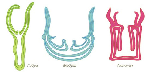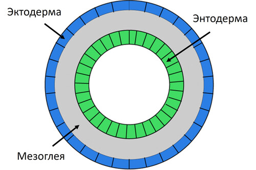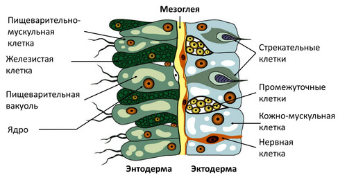 Тело кишечнополостных напоминает двуслойный мешок, открытый на одном конце. Отверстие тела окружено венчиком щупалец и служит ртом, ведущим в замкнутую кишечную полость. Кишечнополостные — двуслойные животные. Их тело состоит из двух слоёв клеток: наружного — эктодермы и внутреннего — энтодермы. Между слоями клеток находится студенистое вещество — мезоглея.