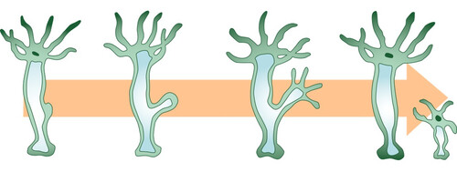 Бесполое размножение гидры. Летом при благоприятных условиях гидра размножается бесполым способом — почкованием. Стенка её тела выпячивается, и на теле появляется бугорок, называемый почкой. Почка увеличивается, и на её вершине появляются щупальца, образуется рот. Так почка постепенно превращается в маленькую гидру.