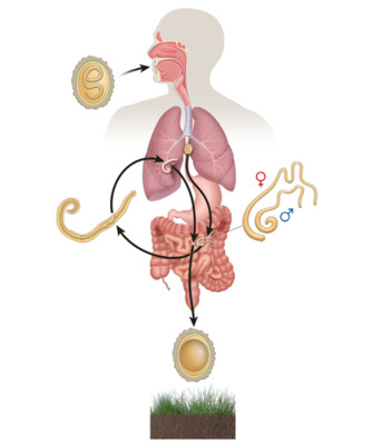 Вместе с плохо вымытыми овощами, ягодами, фруктами или некипячёной водой яйца могут попасть в пищеварительную систему человека. В кишечнике личинка выходит из яйца. Она вбуравливается в стенку кишки и попадает в кровеносные сосуды. С током крови личинка достигает лёгких. Затем она проникает в воздухоносные пути и движется по ним к ротовой полости. Вместе со слюной личинка проглатывается и вновь попадает в кишечник. Здесь она превращается во взрослую аскариду.